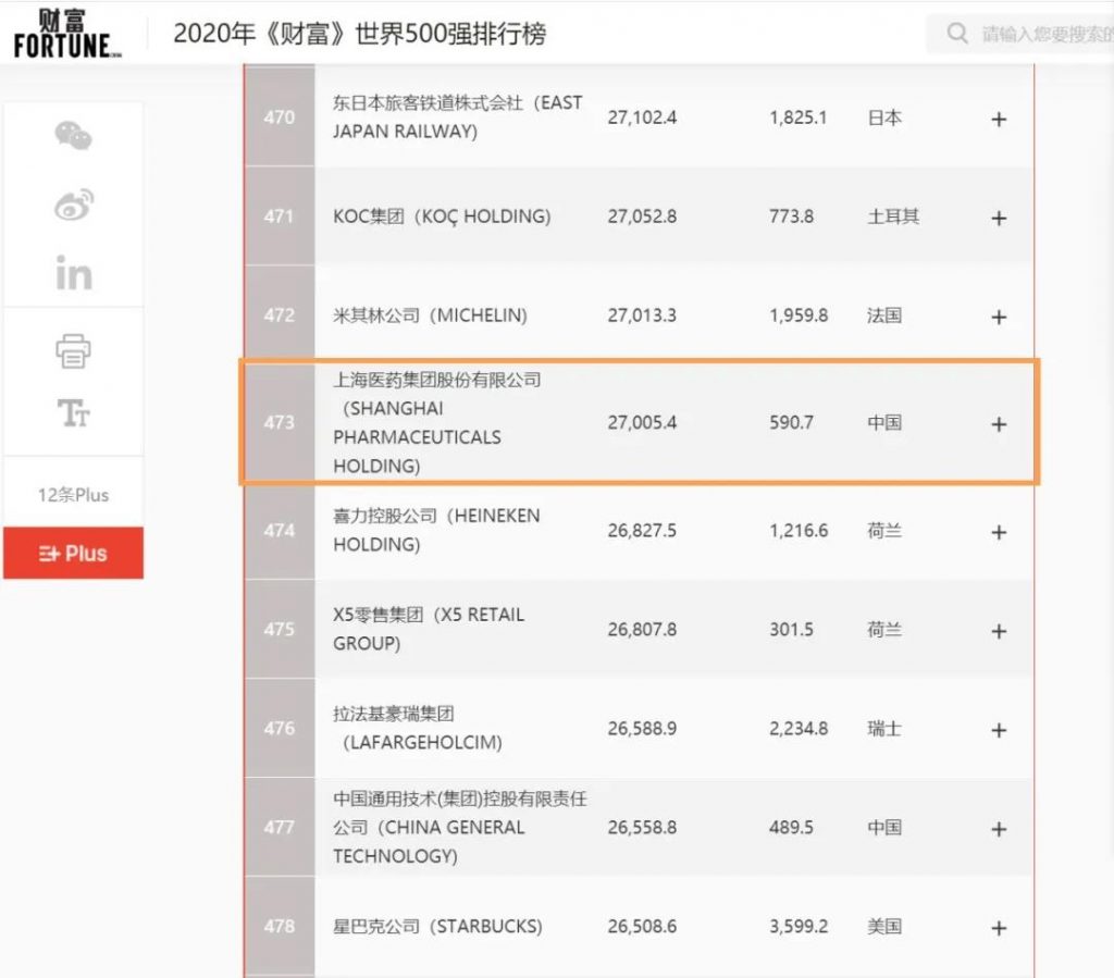 2020年8月10日,《財(cái)富》雜志正式發(fā)布“2020年《財(cái)富》世界500強(qiáng)排行榜單”,上海醫(yī)藥集團(tuán)股份有限公司(601607.SH,02607.HK,以下簡稱“上海醫(yī)藥”)首次進(jìn)入榜單,位列第473位,中國企業(yè)排名第124位。榜單顯示,全球共有21家醫(yī)藥企業(yè)上榜,上海醫(yī)藥是其中僅有的兩家中國藥企之一。